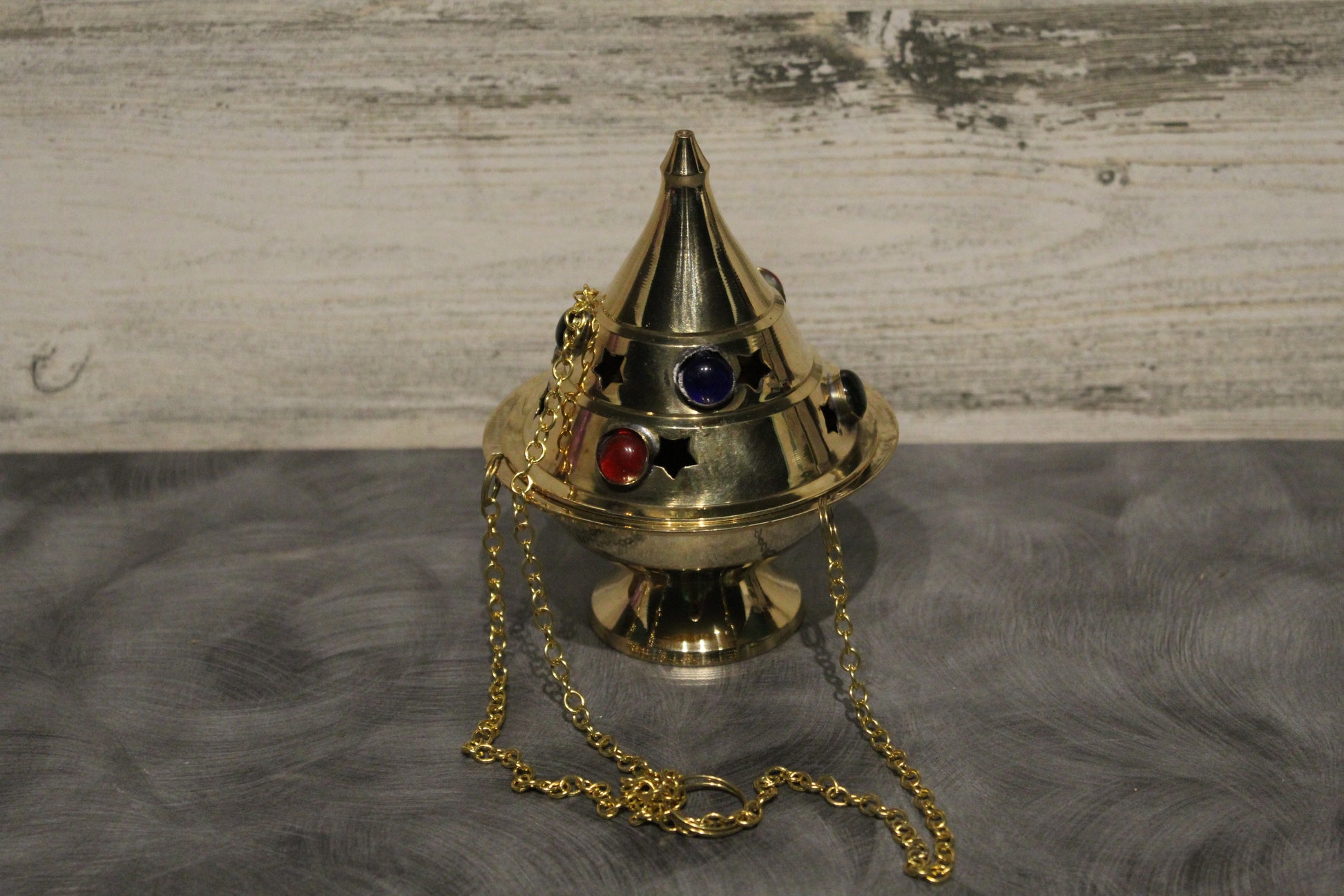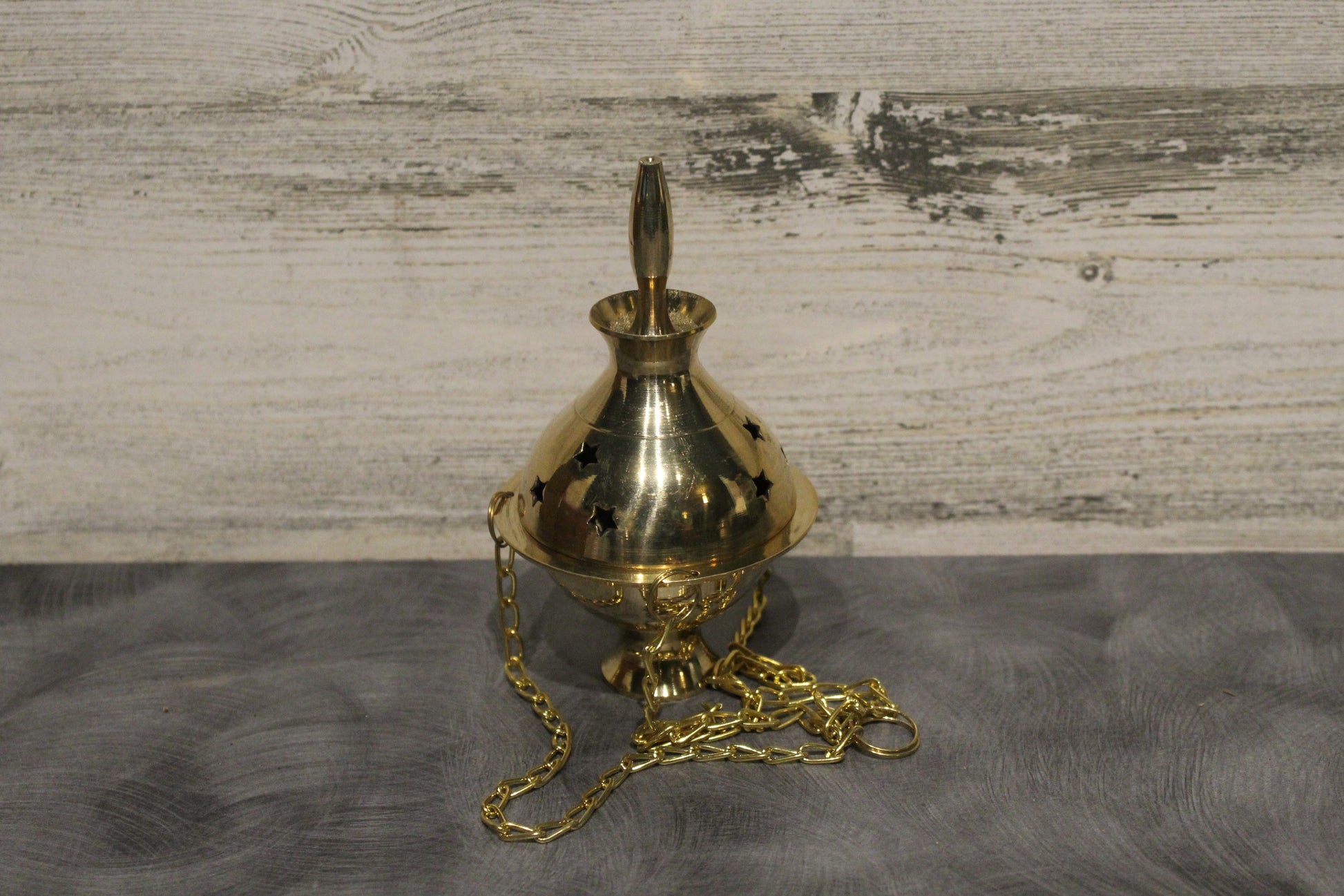 Elevate your home decor with our unique and beautiful Hanging Censer Burner. The perfect way to add a touch of zen to any space. Use this holder to safely contain your incense cones, charcoal and resin or burning herbs. Say goodbye to messy ash and hello to a peaceful ambiance.